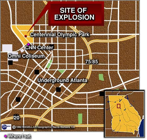 Written in 2006 for the 10th Anniversary of the Bombing by Drew Kuespert When we arrived, we were already having a great time. It was much different than when we were in Bloomington. Heck, they allowed vendors to sell beer right on the street corners and, believe me, we took advantage of that. We met a black woman with a heavy African accent selling mahogany statues. When we asked her where she was from, she replied "South Bend, Indiana." On another occasion, an Atlanta man came up to us at our car asking to bum two bucks so he could "get a burger at Wendy's". We offered him a sandwich instead, but he declined, saying that he needed the money because he just loved those burgers so much. Sure, right. We even had the opportunity to see a women's basketball game, Canada vs. Russia, on tickets given to us by a stranger. There were more players and coaches in the Georgia Dome than fans. It was awesome to be able to get a bucket full of scrap concessions and sneak down to front row, center court to obnoxiously root for Canada. Their point guard actually busted out into laughter as she took the ball up the floor because of our antics, which may or may not have been aided by alcohol. However, at around 1:30am on July 27, that all changed. Randy and Pat (another friend of ours) decided a couple hours before to go into town while I hung out near the park. I can't remember what our agendas were, but, for whatever reason, I decided to stay put. We were planning on meeting up at the entrance to the park at 1:00 and I was miffed that they hadn't arrived yet. So, after pacing for about 20 minutes, I decided to plop my fat ass right there on the sidewalk at the park entrance. There were still tons of people at the park and a rock band was cranking it out. Then, the atmosphere was shattered by a blast that actually picked my 230-lbs. frame completely off the concrete and set me back down hard. I immediately thought "transformer" since the music stopped at the same moment. But, after a few seconds which seemed like a few hours, a flood of people came running out of the park as fast as they could. It was like something out of a movie. I was troubled, but didn't know what to do. I stood up and watched the people go by. No one had any idea what it was and after almost five minutes, someone blew past me talking to a friend and said the word "bomb." I thought about freaking out. I really didn't have any idea of what to do, where to go. Then, I thought about Randy and Pat and I began wondering where they might have been. Were they in the blast zone? I panicked, but only for a few seconds, then I went on the hunt for my compadres. I started my way toward the interior of the park at first, but then I thought about the fact that I really didn't feel like seeing anything graphic, so I backed off. I never did see blood or anything; I was too far away from that. But, I was plenty close enough to be scared. I moved on toward the phone bank. It was a large set of pay phones set up at the end of a large carnival set up by Coca-Cola. I didn't see them. I then started to just meander a bit, take in the chaos. Fifty, seventy, one hundred squad cars. I've never seen that many before. The most amazing cascade of red-upon-white-upon-blue shimmered across the side of Peachtree Plaza. I just stared. I couldn't take my eyes off of everything along Techwood Drive. The constant blast of sirens going between their regular and intermittent pulses echoed throughout the Atlanta canyon. I looked at the people. Crying, wandering painfully around. Calling for their friends, their families. Searching their rendezvous points for the missing members of their groups. Doing what I should be doing. Yes, what I should be doing! I began the fast-paced walk toward the car, something that I had practiced so many times in the past on my way to Ballantine Hall from Briscoe Quad. I got confused a bit on my way through the carnival, which seemed to still be going on, but no one was operating anything. I was as if the Midway at the 4-H fair had been switched on and everyone went to lunch. I finally got out of that rat race and paced myself well as I headed toward our parking spot. By now, I was getting close to the car. We actually had a damn good parking spot considering about half of America was in Atlanta. We had taken the shuttle buses the day before, but it took forever, so we decided to brave it and drive into downtown. I think they scared everyone away by telling them that it would be crowded, but I believe we only paid $10 to park within a couple blocks of the park area. The slate color splashed across the northside of town would have been black if the Olympics weren't in session. I reached the lot and found the car. Randy and Pat weren't there. At that point, I really started to panic. I stood there for only a couple minutes, pacing around the car the whole time. With my hands in my pockets, I started back to the park. Maybe I'll find them there. I'm sure their fine. Randy probably took it all in to write something later. "Drew!" I looked up. Randy and Pat were walking toward me, toward the car. I immediately fall to one knee and began sobbing uncontrollably. I didn't know what else to do. Randy and Pat both began to pat me on the back; they didn't know what else to do. I had never cried in front of any of my friends before. I felt embarrassed, but I felt more relieved than I felt embarrassed, so it felt right. After I cleaned up my face and we shared a smile, we walked back to the phone bank. We tried to joke around a bit with each other to take our minds off of the immediate past as we walked. I found out that they were near the edge of the other side of park from where I was when the bomb went off. There was a video broadcasted over CNN several times an hour in the coming weeks that showed the blast; I believe this was the same vantage point that they had. At 2:30 or so, I called my Mom in Missouri first and she had no idea what was going o